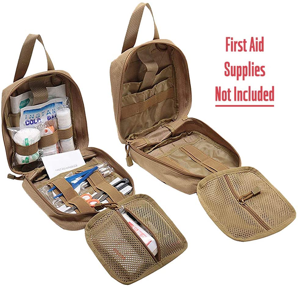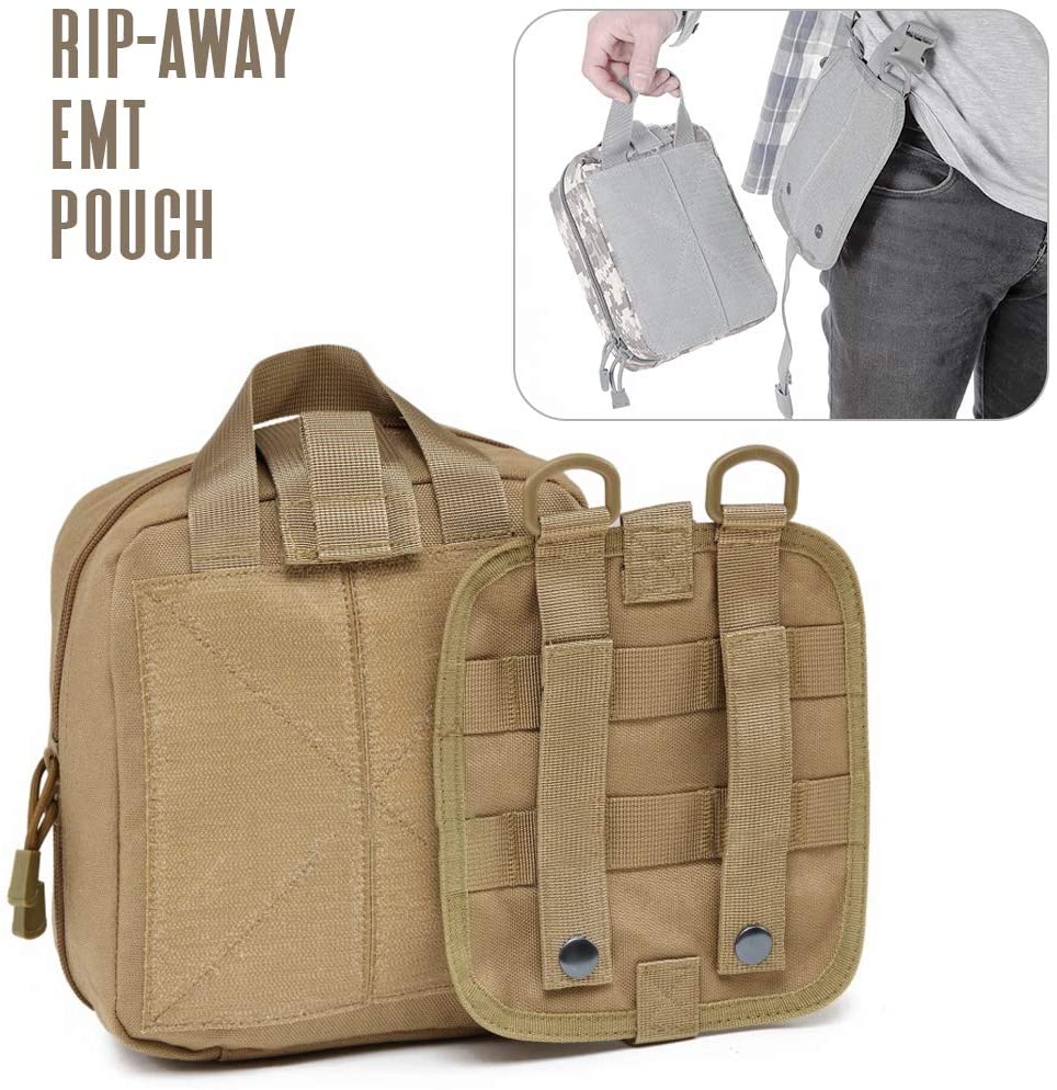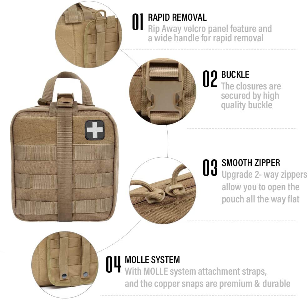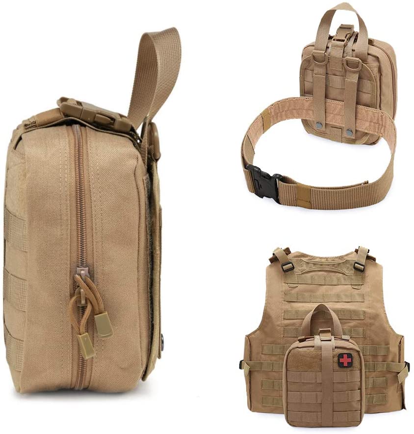 Khaki-taktisen sotilaslääketieteellisen ensiapupussin ominaisuus sisältää punaisen ristin merkin: TRI-FOLD DESIGN: pussikäyttöinen kolminkertainen muotoilu, sisäpuolella on tilavat osastot, joissa on useita taskuja, vahvat joustavat silmukat ja instrumenttien pidikkeet, tarranauha ja vetoketjulliset verkkoosastot pienille ensiaputarvikkeille. LUJA ja KESTÄVÄ: Pussi on valmistettu korkealaatuisesta 1000D nylonmateriaalista, kestävästä naarmuuntumisesta ja kulutusta kestävästä. Tukeva kaksoisompelu antaa tälle taktiselle lääketieteelliselle pussille kestävyyden missä tahansa ympäristössä